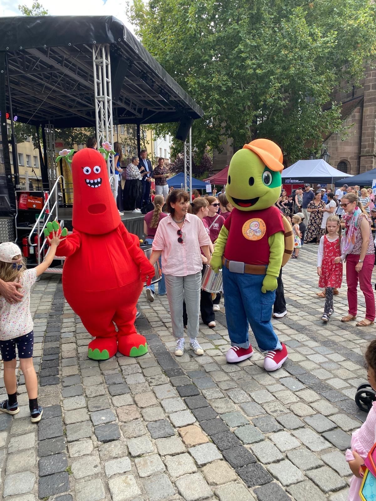 Frizzi, das Maskottchen des Kinderklinikums Nürnberg, hat den diesjährigen Weltkindertag für einen Sonntagsausflug in die Stadt genutzt. Das Jugendamt der Stadt Nürnberg hatte gemeinsam mit zahlreichen freien Trägern und Einrichtungen der Nürnberger Kinder- und Jugendhilfe sowie Vereinen, Verbänden und Organisationen am Jakobsplatz zu einem Aktionstag mit einem kunterbunten Programm mit Musik sowie Bastel-, Sport-, Aktions- und Infoständen geladen. Der Weltkindertag stand in diesem Jahr unter dem Motto „Kinderrechte – Bausteine für Demokratie!“ Selbstverständlich gehörte deshalb ein Auftritt vom städtischen Kinderrechte-Maskottchen Tim mit zum Programm. Gemeinsam mit Frizzi als Vertreter des Kinderbeteiligungsprojekts und Oberbürgermeister Marcus König lief er mit einem lustigen, tanzenden Umzug über den Jakobsplatz und an den teilnehmenden Ständen vorbei. Die Kinder freuten sich außerdem über Fotos mit Frizzi und über die kleinen glitzernden Frizzi-Sticker, die verteilt wurden. Frizzi ist das Maskottchen des neuen Kinderklinikums Nürnberg, das bis 2027 fertig gebaut sein wird. Bei der Planung arbeitet das Klinikum eng mit dem Jugendamt der Stadt Nürnberg zusammen und bezieht im Rahmen eines Kinderbeteiligungsprojektes Kinder und Jugendliche aktiv in die Planung und Gestaltung des Neubaus ein.