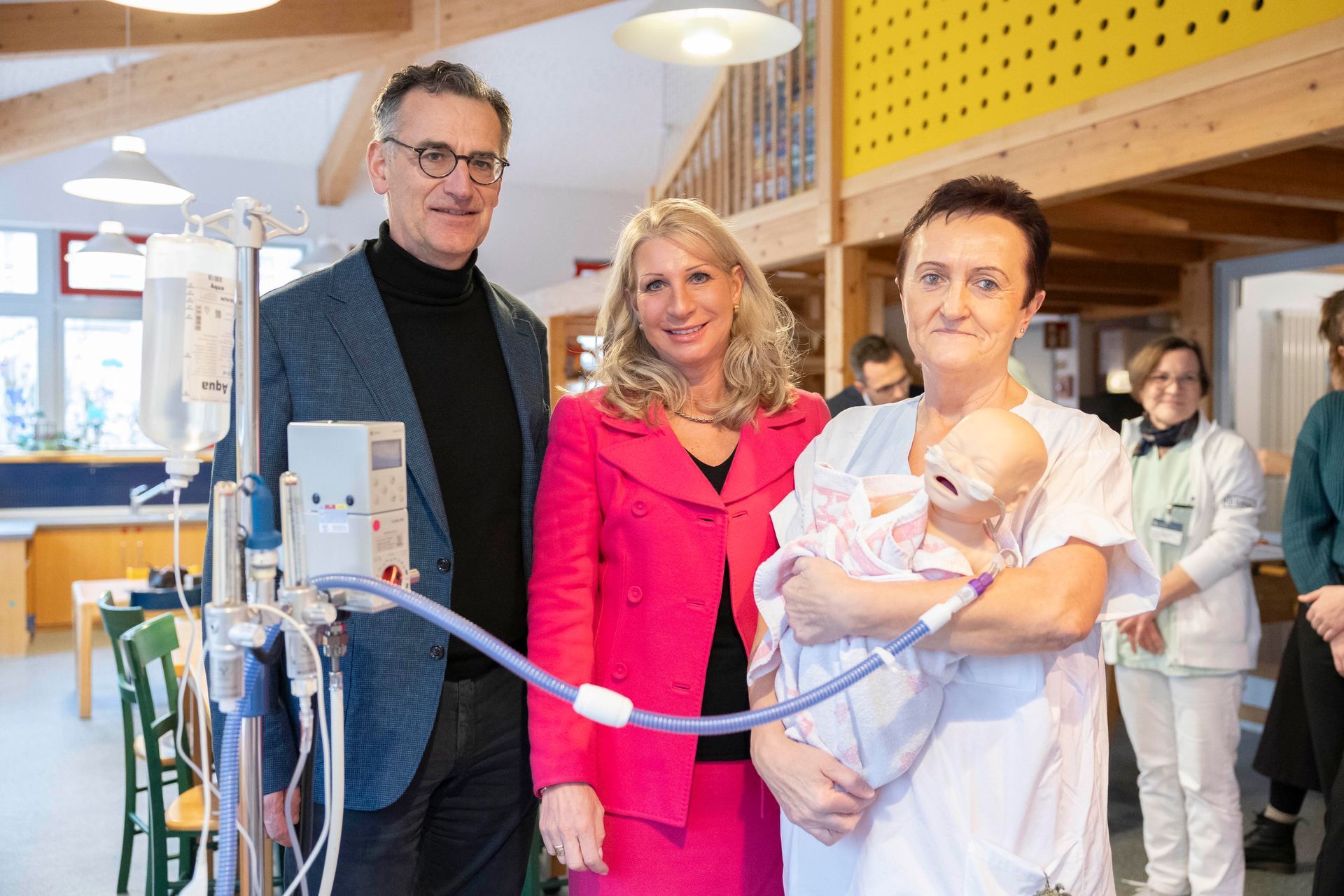 Foto in der Bildergalerie: Stationsleiterin Rita Schalay (r.) zeigt an einer Puppe das Atemunterstützungsgerät, hier mit Karin Baumüller-Söder und Prof. Dr. Achim Jockwig.
