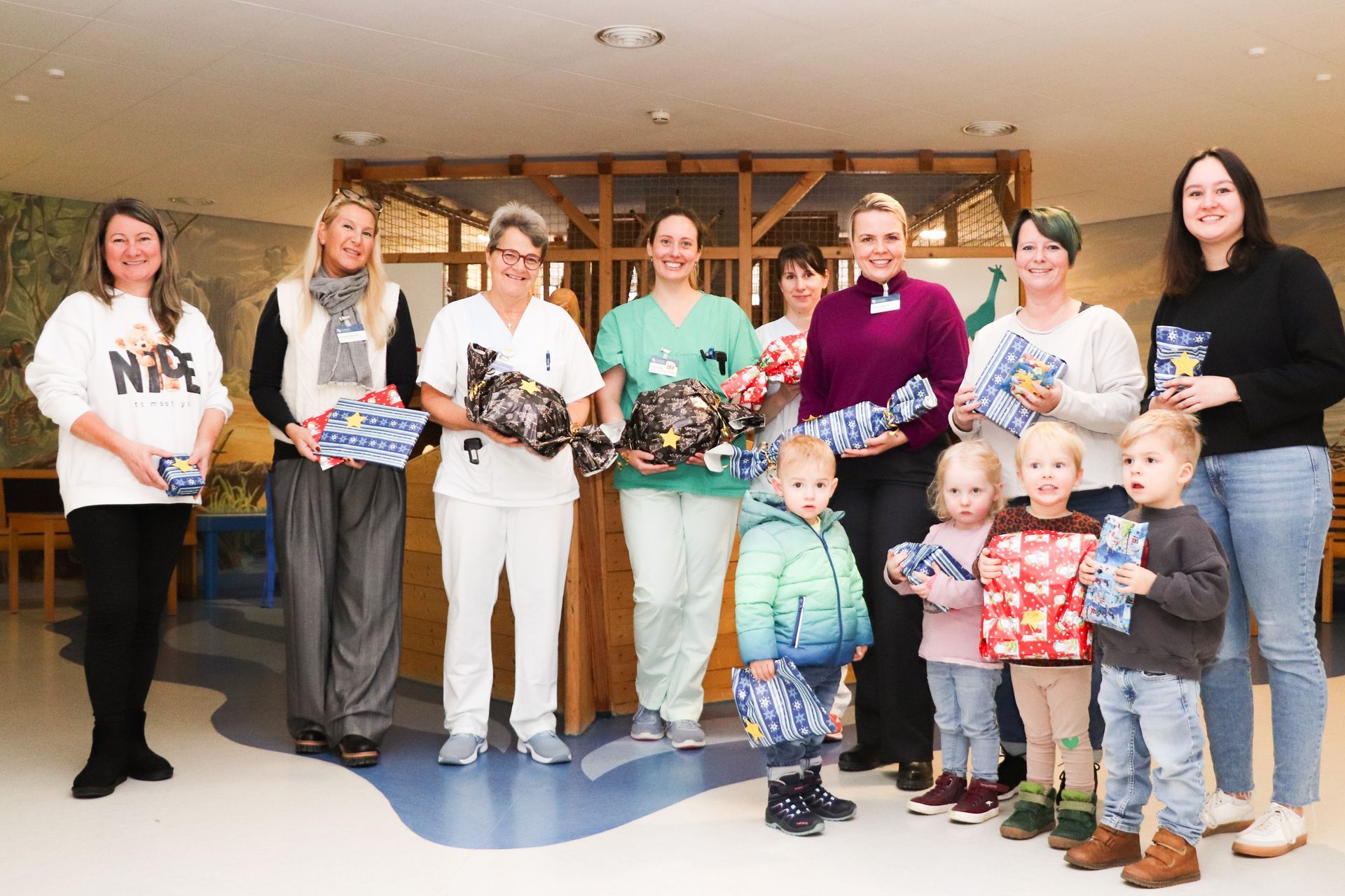 Dort angekommen werden sie von Christine Matschke, Pflegerische Qualitätsmanagementbeauftragte, und den Teams der Kinderklinik herzlich willkommen geheißen. Ausgestattet mit drei randvoll bepackten Tüten gehen die vier Krippen-Kinder nun von Zimmertür zu Zimmertür, um die kleinen Patientinnen und Patienten mit Geschenken zu überraschen. Ganz emsig verteilen die dreijährige Paula und Freunde die bunten Päckchen und freuen sich über jedes Lächeln und über jedes kleine Dankeschön.